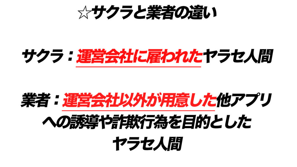業者とは「運営会社以外が用意した他アプリへの誘導や詐欺行為を目的としたヤラセ人間」を指します。