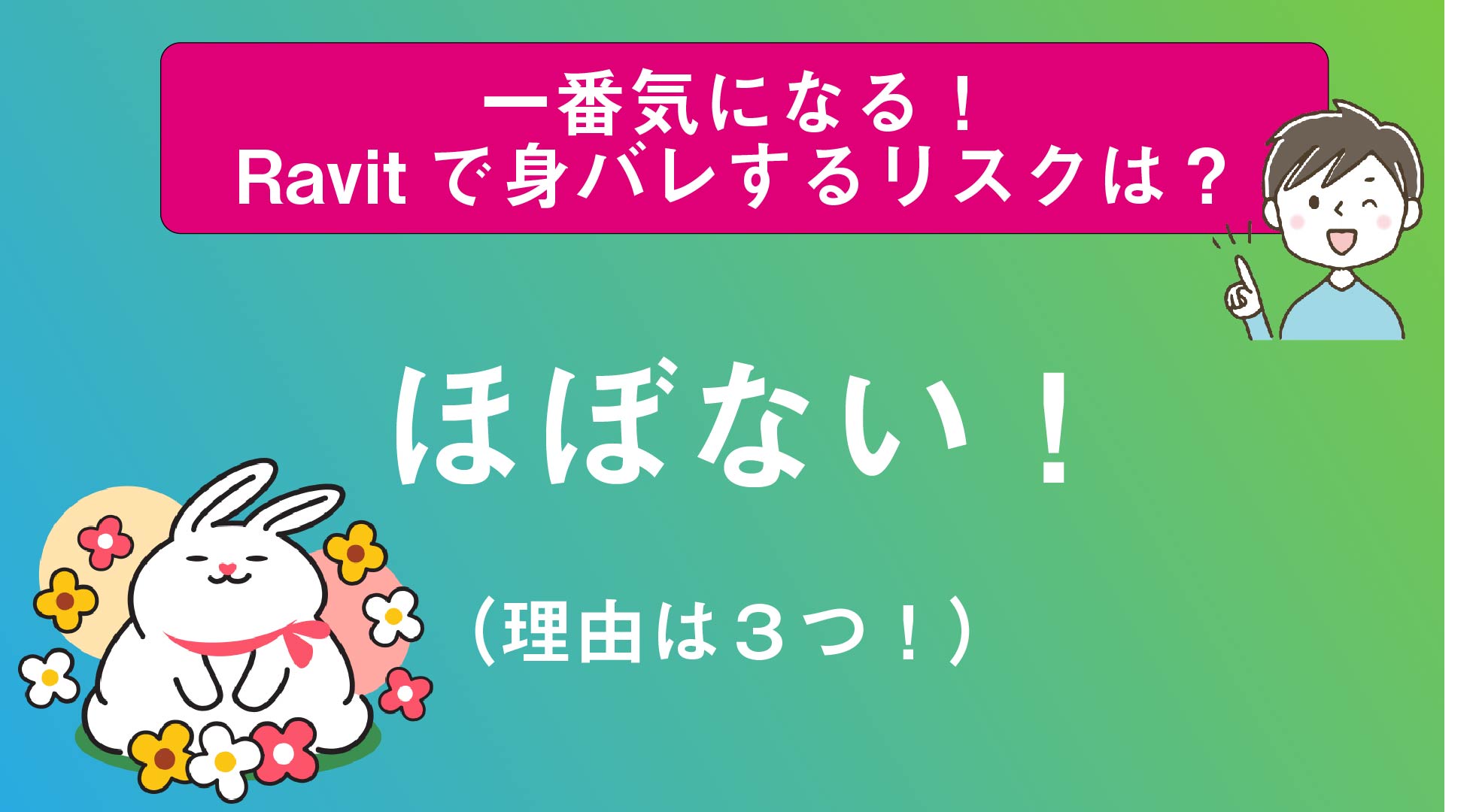 RavitはFacebookアカウントが必須だし、本人確認もしないといけないので、「身バレ」するのではないかと怖い、という人もいると思います。 結論から申し上げますと、Ravitで身バレする可能性はほぼゼロです。
